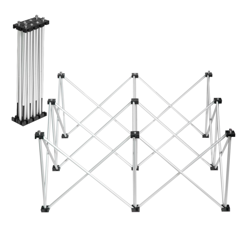 De "easy to set up" podiumelement is gebruiksvriendelijk, sterk, snel en eenvoudig op en af te bouwen. Door gebruik te maken van een uitvouwbare riser is het systeem zeer compact op te bergen.