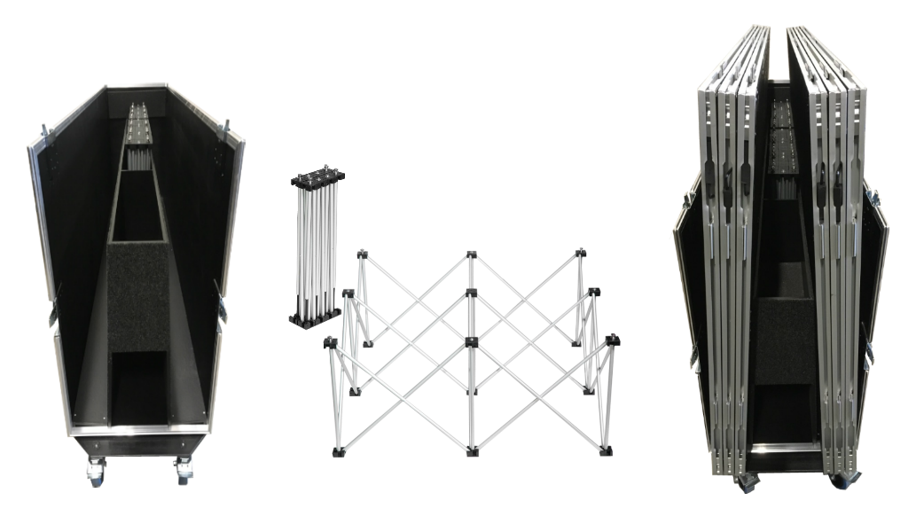 De mobiele podia en podiumelementen van The Stage Managers mobiele zijn zeer handig op te vouwen, zeer compact en gemakkelijk te verplaatsen. Deze opvouwbare podiumsystemen zijn voor verschillende doeleinden te gebruiken. Ze fungeren prima als podium, flexibele tribune, etalagedisplay of catwalk. De podiumsets zijn zeer compact, sterk, elegant en eenvoudig te transporteren in een op maat gemaakte flight-case. Deze flight-case is oerdegelijk en smal, waardoor de kist in elke ruimte gereden kan worden. De voorzijde van de kist kan geopend worden, zodat de decks in- en uit de kist geschoven kunnen worden. Alle losse onderdelen passen direct in de kist, zodat de materialen op lange duur niet verloren gaan.De flight-case van een 6m2 set kan ook in een lift gereden worden. Het podium kan worden voorzien van een afrokdoek, podiumtrappen, transportramp, stoelstoppers en veiligheidsrailing.